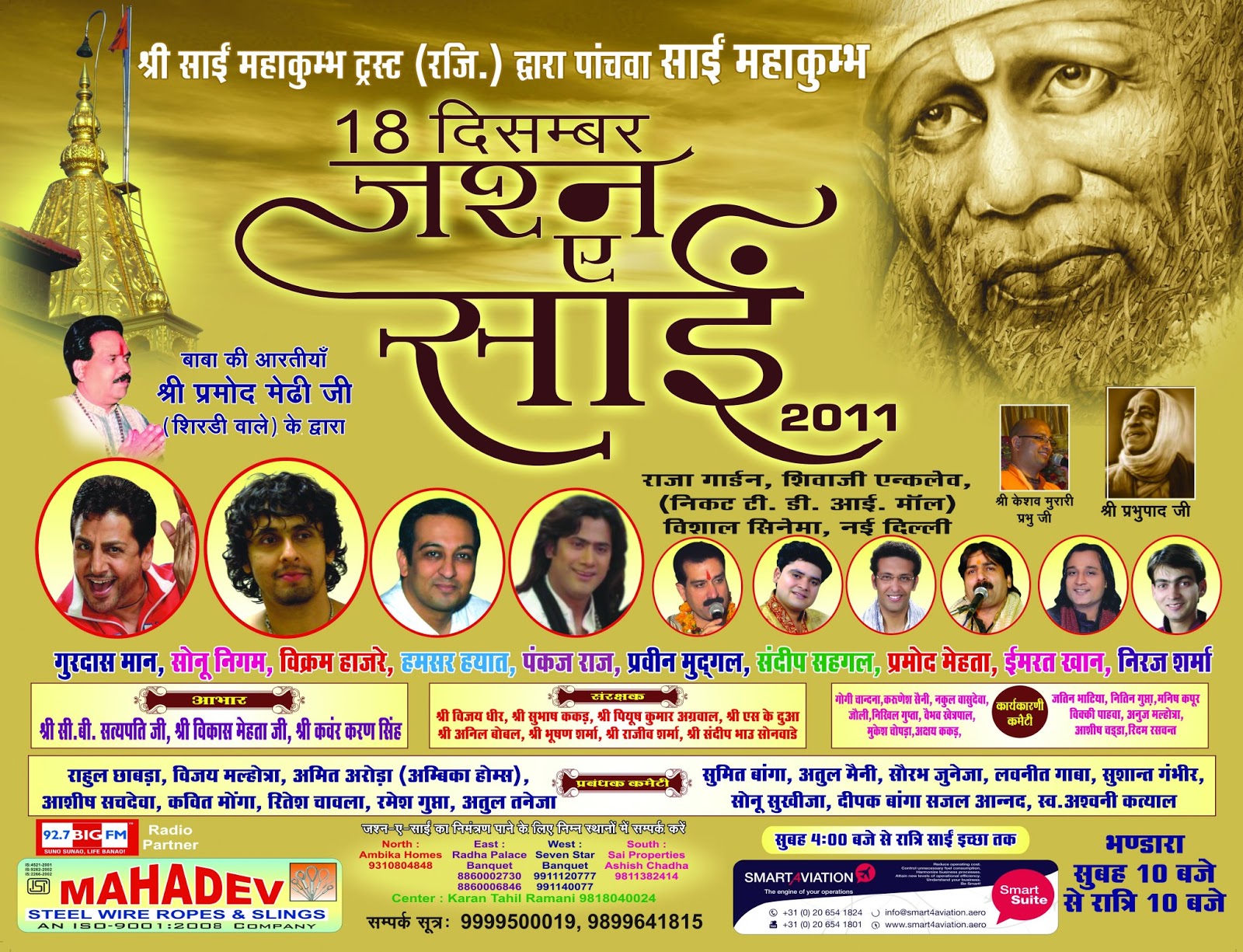 Sunday 18th December 2011, Sai MahaKubh, a huge event dedicated to Shirdi Sai Baba will happen in New Delhi. On this occasion many famous artist and singer like Pramod Mehdiji (Sai Baba aarti), Sonu Nigam, Gurdas Maan, Vikram Hazra, Hamsar Hayat will be performing songs dedicated to the divine.